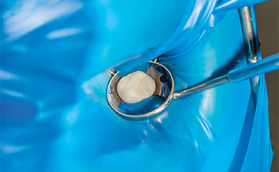 治療対象とする歯の周りにゴム状のシートを敷き、唾液の飛沫を防ぎます。治療後の感染リスク低減に大きな効果が期待できます。