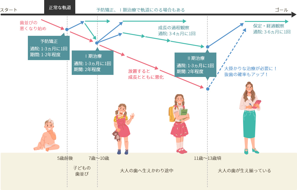 永久歯が生え揃うまでに歯並びを整えるためには、乳歯だけの時期、および乳歯と永久歯が混在する時期から対策する必要があります。当院では4歳ころから始める予防矯正、6歳ころから行うⅠ期矯正にも対応しており、永久歯が生え揃う11~13歳ころを目標とすることも可能です。