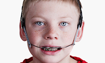 上顎前方牽引装置とも呼ばれ、顔に装着することで上顎の成長を促す効果が期待できます。口腔内装置とゴムの力を利用して、受け口(反対咬合)の改善のために使用される装置であり、7~12歳ころのお子さんを対象としています。