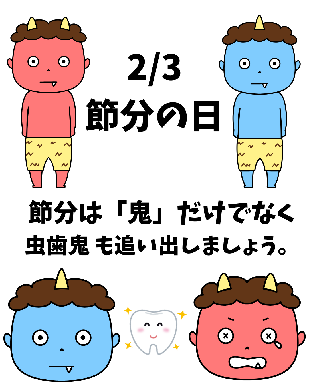 2/3は節分の日 豆まきで鬼は外! 歯みがきで虫歯鬼も外! 毎日のケアで虫歯ゼロを目指しましょう お子さんも一緒に楽しく歯…